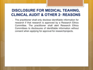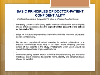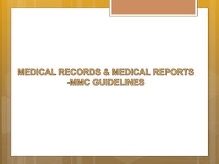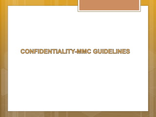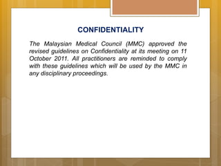 The Guidelines laid out in this booklet on Good Medical Practice are intended to be positive approach and to convey to doctors what they should do. This document sets out the MMCs guidelines on confidentiality. Please email the Advocacy Director Chua.